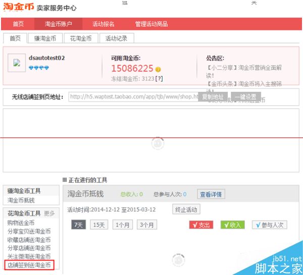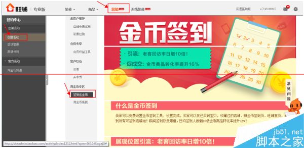 第一步:點(diǎn)擊上方地址進(jìn)入金幣后臺(tái),找到左側(cè)導(dǎo)航“店鋪簽到送金幣”工具,點(diǎn)擊進(jìn)入(下圖) 。