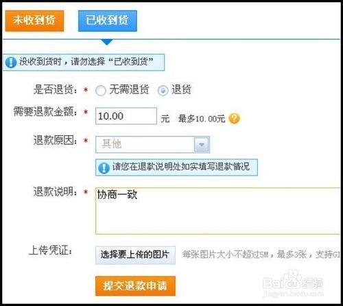 注意:在“未收到貨”時退款金額是不能修改的,默認是全部的交易金額。