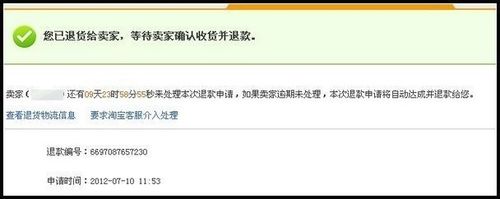 第四步:賣家有5天的時間來同意和拒絕買家的退款申請,若賣家同意退貨協(xié)議,頁面上會出現(xiàn)賣家的退貨地址,買家可以根據(jù)此地址進行退貨的操作。退貨后,請到退款頁面“填寫退貨信息”