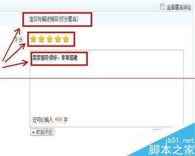 四、點擊“評價”進入新頁面,然后填寫寶貝與描述相符評價內容即可,每個星星選中即表示5分。