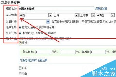 5、點(diǎn)完后,再根據(jù)里面的內(nèi)容,填寫:運(yùn)費(fèi)模版名稱、寶貝地址、發(fā)貨時(shí)間(主意發(fā)體內(nèi)時(shí)間最好不要填,防止你因?yàn)闆]有及時(shí)發(fā)貨造到買家投訴)、是否包郵(選自定運(yùn)費(fèi))計(jì)價(jià)方式,根據(jù)自己所賣的商品決定、運(yùn)送方式,選快遞即可。