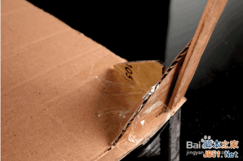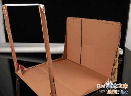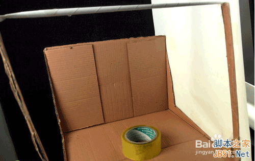 7、剪掉的紙板不要扔掉,這里還有用。剪幾片四指寬的紙板,從中線對折,然后用透明膠扎緊,就做成了一根較堅固的立柱。然后將立柱垂直固定在紙箱底面的角上。為了保持垂直不倒,可以剪兩片小三角形的紙板,用透明膠布粘在立柱的底部。到此為止,攝影棚的骨架基本就做完了。