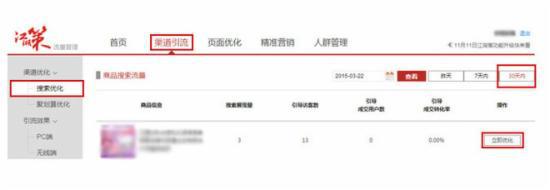 江湖策——渠道引流——搜索優化——根據需要選擇昨天7天30天——選擇對應寶貝立即優化——然后就可以查詢這個寶貝全店或PC或無線端的引流關鍵詞和成交關鍵詞的主要數據。