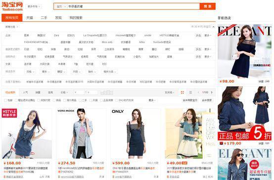 然后在淘寶的搜索框中輸入我購物意向的關鍵詞“牛仔連衣裙”,