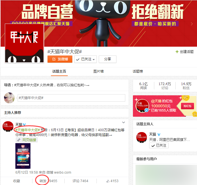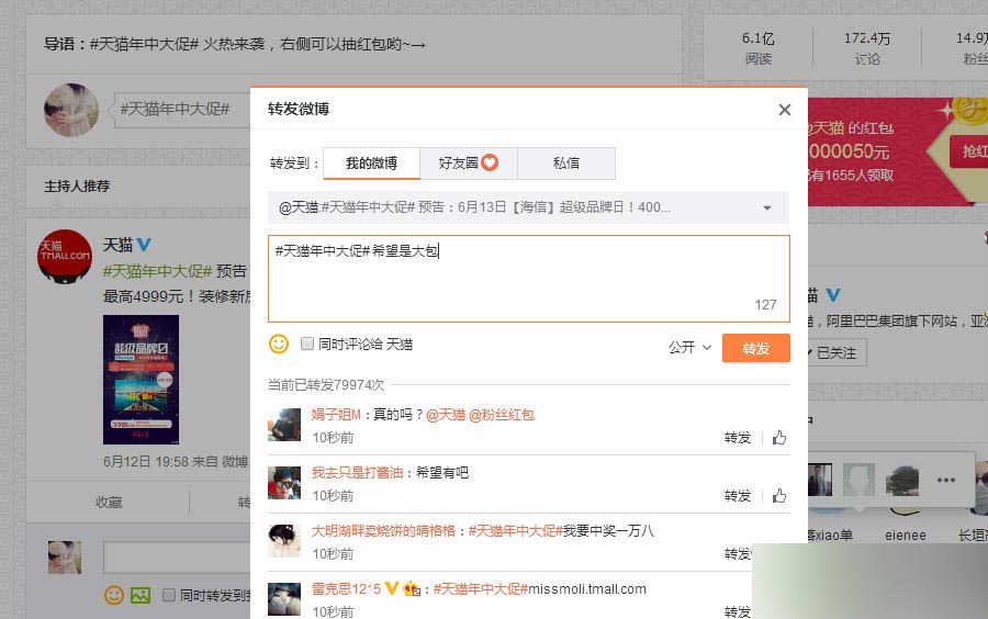 點擊馬上參與,來到天貓年中大促微博話題頁,點擊轉發且帶有#天貓年中大促#