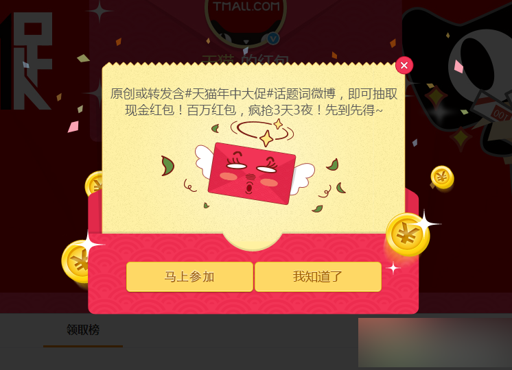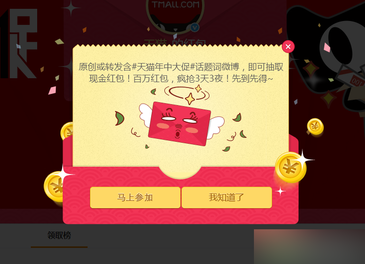 首先進入天貓年中大促搶紅包網頁(地址:http://huodong.weibo.com/hongbao/1768198384)