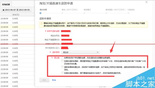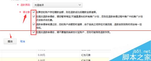 注意事項:申請退款的時間是除了每個月27號到次月8號的時間,申請退款的時候注意事項里面的4個勾選之后才可以提交。