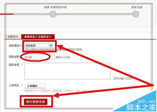 4、填寫退款的相應信息,包括退款原因、退款金額;退款說明和上傳圖片是選填項,可以填寫,也可以不填。最后別忘了點擊”提交退款申請“。