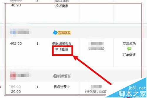 2、在已買到的寶貝一欄,點擊”申請售后“進入下一步。如下圖示。