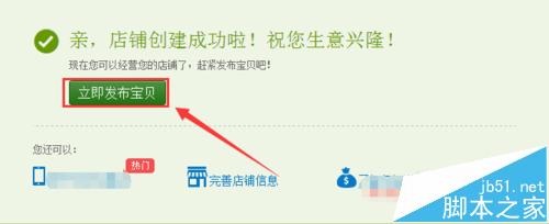 3、店鋪創建成功后會有如圖所示的提示,點擊“立即發布寶貝”