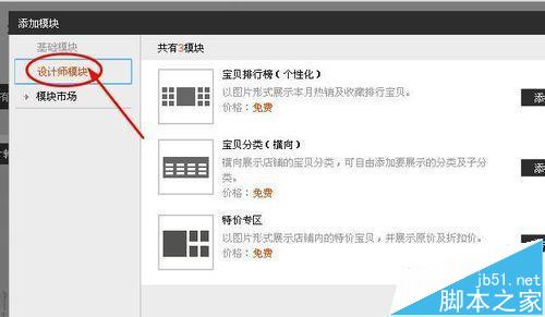 5、如果使用的是購買的模板,就切換到,設(shè)計(jì)師模塊,找到自己需要的模塊,添加。方法同上。添加完成,就可以開始編輯。