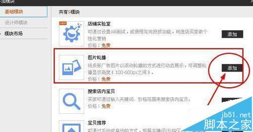 3、進(jìn)入后有三種選擇。第一個(gè),基礎(chǔ)模塊。意思是系統(tǒng)自帶的模塊,包括輪播、自定義內(nèi)容區(qū)、寶貝推薦等等常用模塊,都在這里。選擇好自己需要的模塊,點(diǎn),添加。