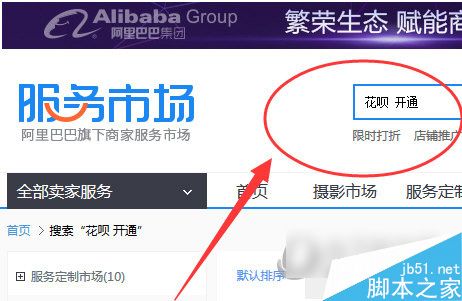 點擊我要訂購以后,進入淘寶的服務市場,搜索“花唄 開通”關鍵詞。