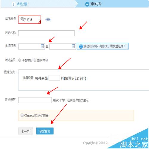7、接著點擊【打折】,進入打折的設置頁面了。你可以根據自己個人情況設置打折的對象,點擊【下一步】,就填里面的資料信息,點擊【確定提交】就可以完成打折設置了。