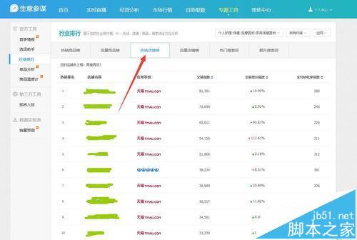 6、選擇熱銷店鋪榜,就可以看到行業前100店鋪的名稱、信譽、交易指數(交易額)、交易增長幅度和支付轉化率指數。