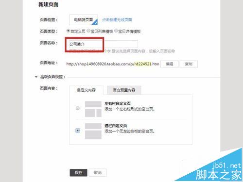 5、在“新建頁面”對話框,“頁面名稱”輸入名稱,例如“公司簡介”如圖所示。再按“保存”