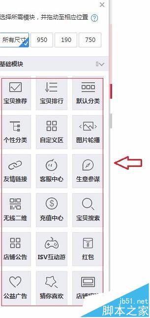 5、模塊有分950PX、750PX、550PX、190PX,對應專業版本的店鋪有950PX和550PX,基礎版的店鋪只有190PX,因此你的店鋪如果是專業版本的所有尺寸的模塊都可以添加;基礎版的只有750PX和190PX的模塊,招牌都是統一是950PX的。