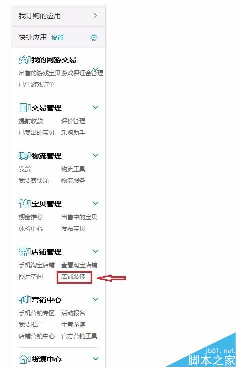 2、鼠標下拉,在左側中間的位置找到“店鋪裝修”,點擊進入裝修頁面。