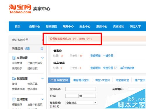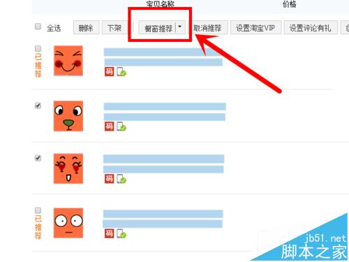 5、設置商品櫥窗推薦,在沒有顯示“已推薦”的商品的前面有一個小方框,點擊小方框打勾(這里的櫥窗位只剩2個,所以我點擊2個寶貝,以此類推)