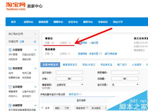 3、先查看自己有多少櫥窗位,然后看看自己已使用了多少個,這里的總量是19,也就是這里有19個櫥窗位,已經用了17個
