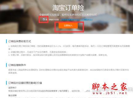 4、之后會(huì)出現(xiàn)一個(gè)協(xié)議頁(yè)面,《消費(fèi)者保障服務(wù)協(xié)議》《訂單險(xiǎn)協(xié)議》,觀看完協(xié)議內(nèi)容點(diǎn)擊上面小方框,然后點(diǎn)擊“立即加入”即可。