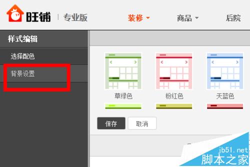 3、接下來一步很關鍵,點擊頁面最上面的裝修下拉里面的“樣式管理”,選擇左面的“背景設置”然后點擊“頁面設置”接下來背景顏色的對號去掉,點擊“保存”,之后點擊發布就ok了,就可以去查看效果了!