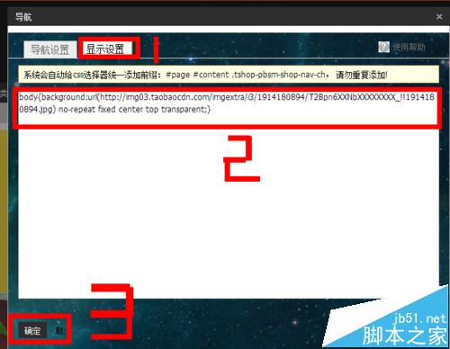 2、body{background:url(圖片地址) no-repeat fixed center top transparent;}上面代碼中圖片地址要放上你剛上傳到圖片空間里面的圖片的地址,點擊“確定”按鈕。