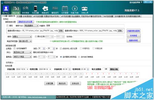 設(shè)置搜索方式,輸入關(guān)鍵詞和直通車圖片地址(兩個(gè)),可以根據(jù)需要選擇瀏覽時(shí)間、流量數(shù)等。如果要刷展現(xiàn)的話就勾選上展現(xiàn)即可。測試前先測試任務(wù),然后再發(fā)布任務(wù)??梢栽谌蝿?wù)管理中查看任務(wù)狀態(tài)