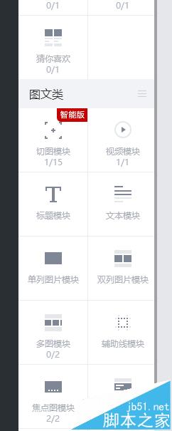 5、在左側(cè)的裝修模塊你會(huì)發(fā)現(xiàn) 新版的手機(jī)端裝修增加了不少的新模塊 好了廢話補(bǔ)多少 在左側(cè)裝修模塊中 找到 圖文類 點(diǎn)擊 就會(huì)出現(xiàn) 切圖模塊