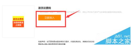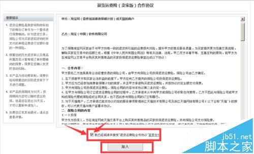 5、加入。在加入前它會(huì)有一個(gè)合作協(xié)議,我們只要勾選一下“我已經(jīng)閱讀并接受“退貨運(yùn)費(fèi)險(xiǎn)合作協(xié)議”,然后點(diǎn)擊加入就可以