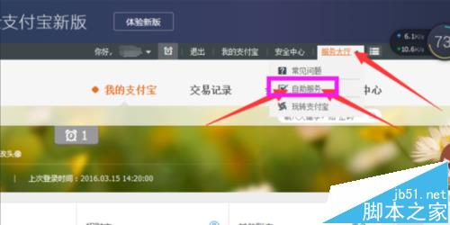 6、登錄淘寶大號的支付寶,登錄好了大號之后,把鼠標(biāo)放在服務(wù)大廳不要動,然后在點擊自助服務(wù)!