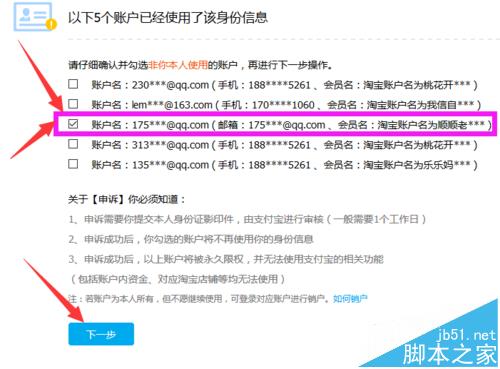 8、出現(xiàn)的是這個頁面,你要解綁哪個淘寶小號,你在前面打勾就可以,不解綁的不要打哦!再仔細(xì)看一下下面的條約哦!勾完了之后點擊下一步!