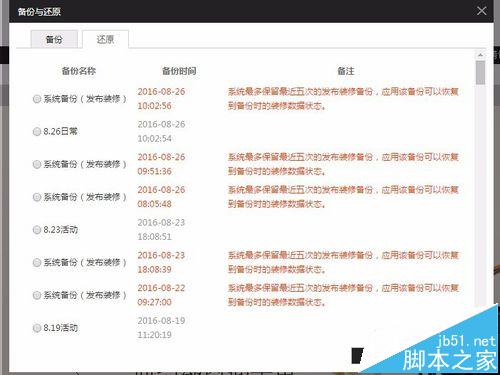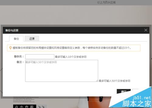 3、備份完后,你就可以進行裝修了,當然你裝修好了也注意要備份哦,要不然恢復裝修之前的頁面,你的裝修不就白費了嗎!?所以要注意合理的進行備份和還原,這樣可以使得你在接下來的裝修中更加方便和快捷。