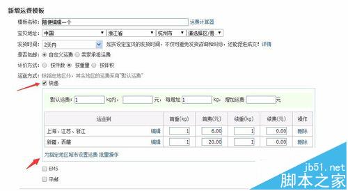 5、勾選快遞那一欄,默認運費指的是你沒有設置的地方 運費是多少起步的,可以設置每增加kg增加多少運費,下方的指定地區(qū)城市設置運費,在那里可以設置新疆西藏的運費或者偏遠地區(qū)的