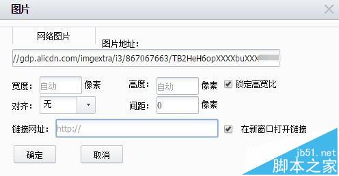 7、然后,我們回到剛才第4步的圖片設置框。在“鏈接網址”的框內粘貼剛才復制的收藏店鋪的鏈接。然后,再在“在新窗口打開鏈接”這里打上勾,這里打上勾,是當買家點擊店招時,網頁能跳轉到收藏店鋪的操作頁面。最后,點“確定”。