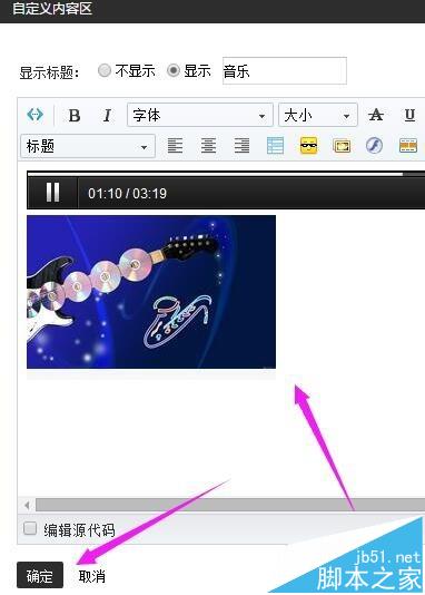 6、然后,在框內粘貼剛才復制的音樂代碼。再點下源碼的圖標,在框內上傳一張有關音樂的圖片。然后,點“確定”。