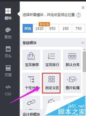 2、進入裝修頁面,在“模塊”這里,鼠標點住“自定義區”不放,移到右邊,在右邊添加“自定義區”模塊,如圖所示: