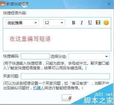 6、設(shè)置好后,就點(diǎn)下“保存”,即這條快捷短語(yǔ)就生成了,展示在短語(yǔ)展示區(qū)內(nèi)。與買(mǎi)家聊天時(shí)就能使用此短語(yǔ)啦。