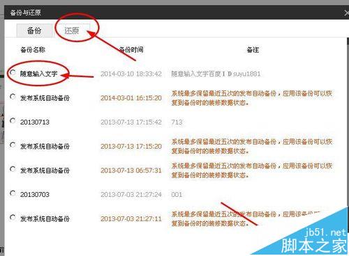 5、備份好之后,就可以直接退出了。下面是如何恢復(fù)備份。同樣的方法,進(jìn)入到備份界面。這時(shí)候,注意看,選擇“還原”,在里面找到自己需要的備份,選擇好之后,點(diǎn)應(yīng)用備份