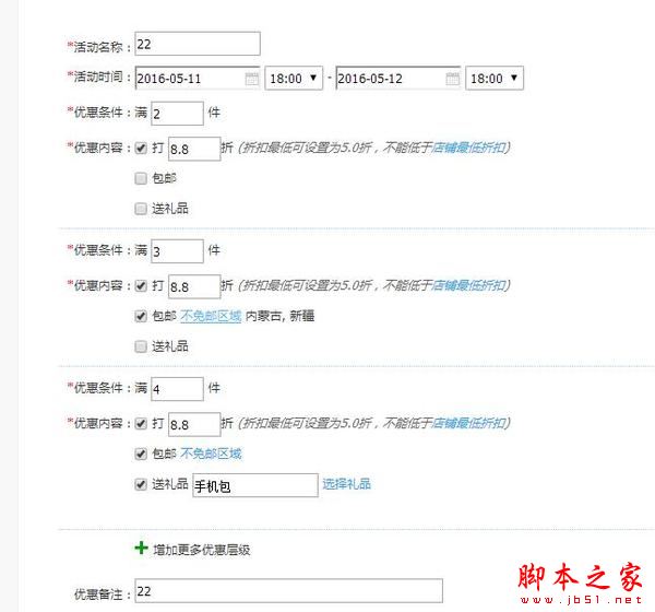 如上圖設置好,點擊保存就可以了,我們可以設置普通優惠,也可以設置多層級優惠,具體的采取哪種形式的優惠方式,結合店鋪的實際情況和店鋪的活動力度去設置就ok了