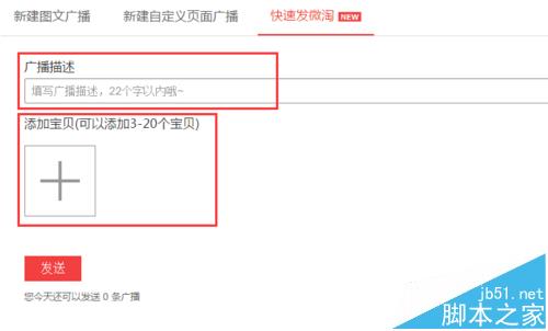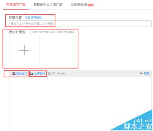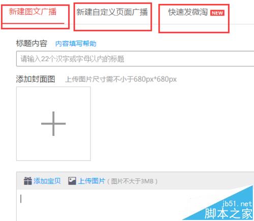 5、新建圖文廣播需要想好標題,提前做一張680px*680px的封面圖,主題內(nèi)容可以圖文結合,也可以添加寶貝鏈接(其中上傳圖片不大于3MB,且寬度像素不能低于480px),下面還可以添加活動鏈接以及頁面鏈接