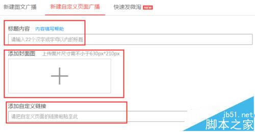 6、新建自定義頁面廣播也需要想好標題,提前做一張630px*210px的封面圖,然后加上自定義頁面的鏈接就可以了
