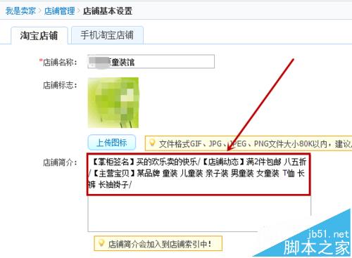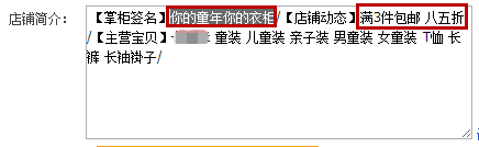 例如:【掌柜簽名】/【店鋪動態】/【主營寶貝】親子裝 童褲/