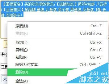 全選“【掌柜簽名】買的歡樂賣的快樂/【店鋪動態】滿2件包郵八五折/【主營寶貝】某品牌童裝兒童裝親子裝男童裝女童裝T恤長褲長袖褂子/”后,單擊右鍵刪除。再單擊右鍵刷新后,又出現同樣的內容,此時把要修改的內容刪掉,填上新的內容。保存即可。