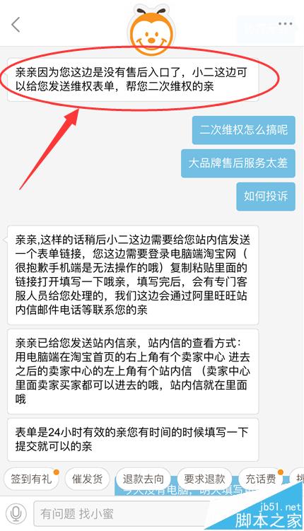 5、如果與賣家溝通無果的情況下,人工小蜜會瀏覽你與賣家溝通的聊天記錄,然后建議你二次維權;會發送相應的表單鏈接,到淘寶站內信郵箱;