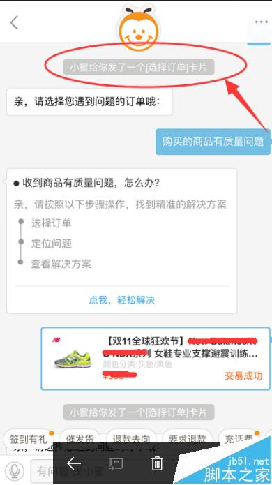 3、人工小蜜會發給你一個選擇訂單卡片,你在卡片中,選擇有問題的訂單鏈接,發送給小蜜;