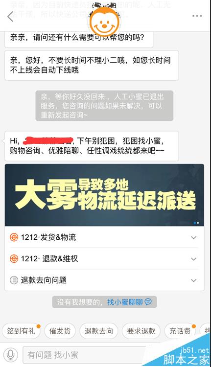 2、進入”我的小蜜“咨詢頁面;默認為機器小蜜,這種情況下肯定要聯系人工小蜜;只要你輸入”購買商品質量問題“,系統一般會自動切換為人工小蜜;