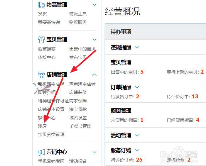 2、然后左側(cè)找到店鋪管理中的賬房。