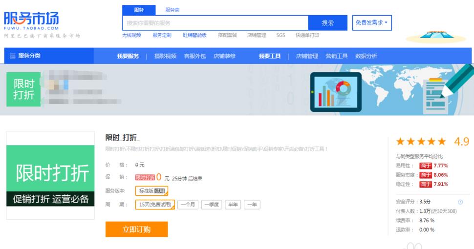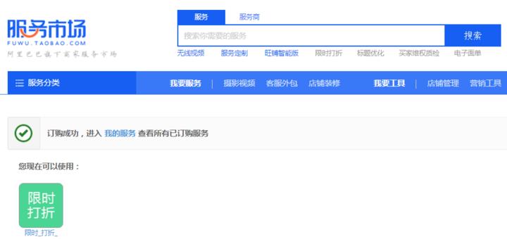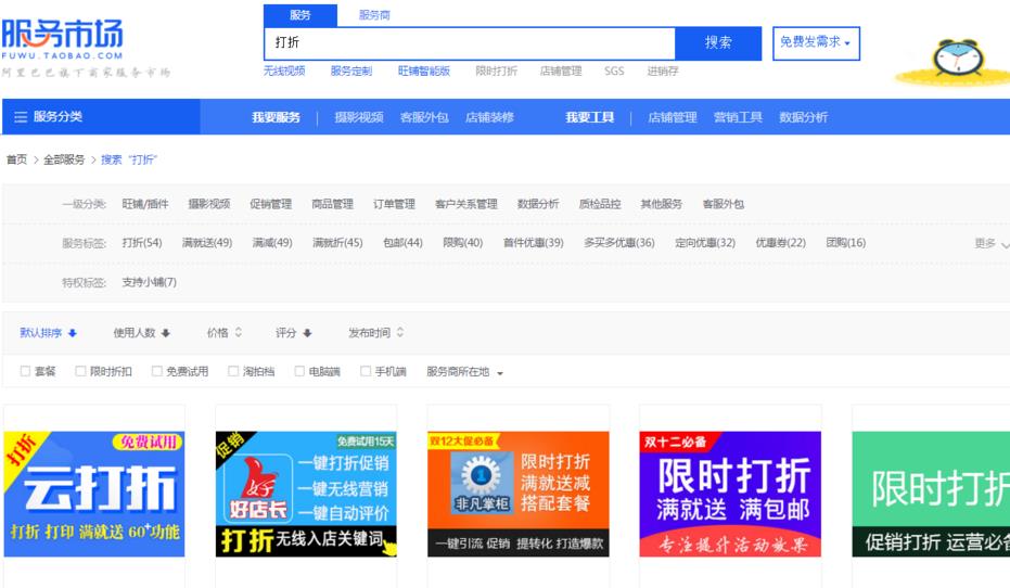 2、來到了服務市場,然后搜索一下“打折”,這樣就會列出所有的提供打折服務的服務商
