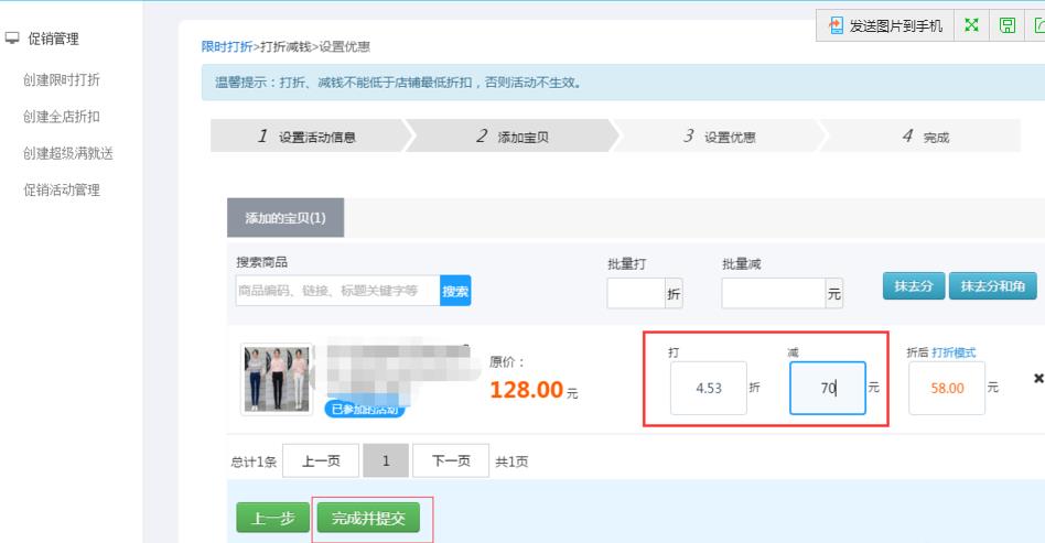 7、選擇自己的寶貝,可以進行設置多少折或者減價多少處理,設置完成后就可以提交了,這樣寶貝就成功打折了